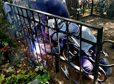 Монтируем оградку, вваривая согласованные с клиентом уголки. По низу пускаем металлическую ленту, которая обозначит границу выложенной брусчаткой территории.
