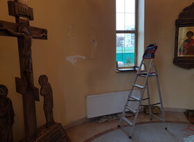К нам с нестандартным заказом обратился настоятель одного из храмов – им требовалось изготовить новые таблички памяти погибшим военнослужащим. Приехав на место, мы первым делом принялись за осмотр фронта работ. На фотографии ниже видна церковь, в которой нам и надлежало заменить памятные надписи.