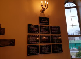 На фотографиях ниже отображено состоянии стены памяти после завершения всех работ. Таблички висят в определённом порядке, надписи легко читаются даже при небольшом освещении, а общая цветовая гамма удачно вписывается в церковный интерьер.